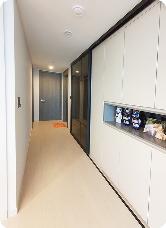 - 현장 실측: 아파트 구조를 고려하여 정확하게 실측하였고, 특히 거실과 현관 사이의 폭과 높이를 철저히 체크하여 맞춤 제작에 박차를 가했습니다.